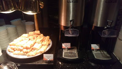 Evening Cocktail 17:30-20:00提供熱食及酒精類飲品,熱食只有三種:印度烤雞、京燒明蝦球和素春卷,連飯、麵都無,選擇性不多,因為剛從JW Marriott Macau (按此)住完過來、兩者都屬於兩大集團萬豪和希爾頓的奢華品牌,又是兩大酒店集團始創人的兒子為紀念父親而設立、用父親名字作為品牌,難免令阿迪哥將兩者作比較,這次Conrad確實被比下去。