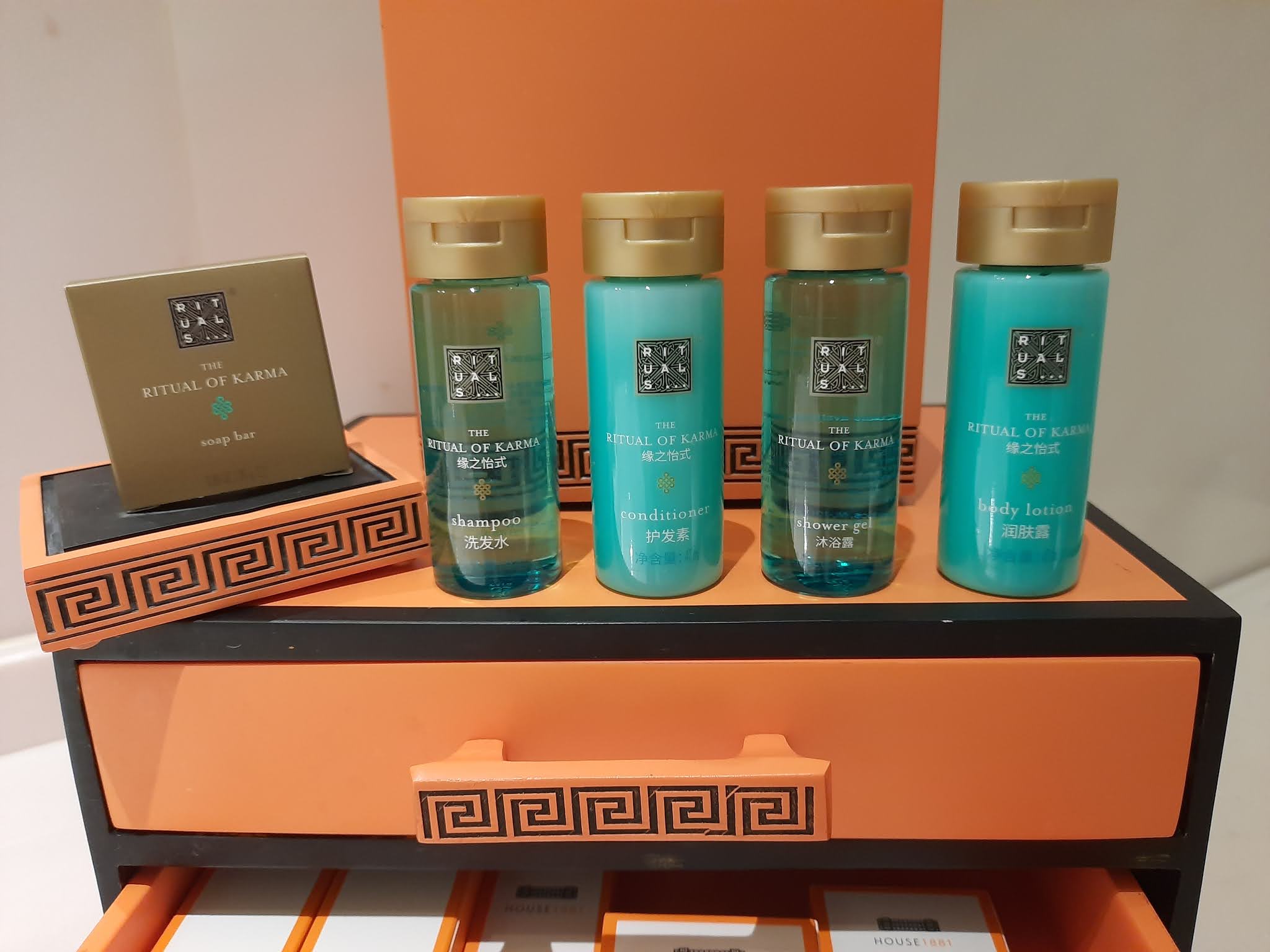阿迪哥非常注重沐浴備品,尤其是當入住一些奢華酒店、若然不知道他們提供什麼品牌沐浴備品就不會刻意預早找尋答案,到入住時才會有驚喜,今次酒店所提供的備品是荷蘭品牌Rituals,Rituals是一個很年輕的洗護用品品牌,成立於2000年,總部位於阿姆斯特丹,而這款The Ritual of Karma緣之怡式系列靈感來自印度教信仰,產品以荷花及有機白茶拼配出清新花香味,味道淡香、清新,說實話沐浴備品跟阿迪哥理想的確有落差,酒店可算是本港入門價錢最高的酒店之一,即使不供應Hérmes或BVLGARI、至少都是Acqua di Parma或Molton Brown吧。