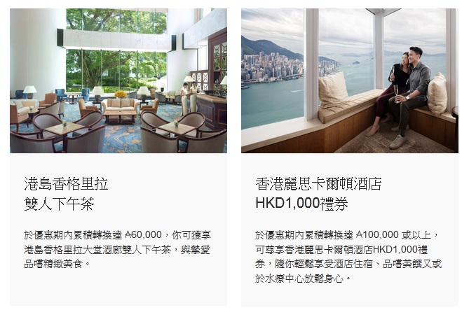 國泰又出特選會員優惠,類似舊年12月優惠期內換滿指定數目亞洲萬里通里數送半島下午茶嗰種玩法,今次嘅優惠係以信用卡積分換里數、滿足指定數目里數可享以10里換港島香格里拉雙人下午茶或香港麗思卡爾頓酒店HK$1,000禮券,不過今次優惠活動沒額外里數獎勵,不過其實今個月較早前亦有一個「躍升你的日常獎賞」特選活動,其實變相將之前個活動一分為二,除非兩個活動同時中哂特選、否則今次呢個送酒店禮遇活動就唔值得硬衝。