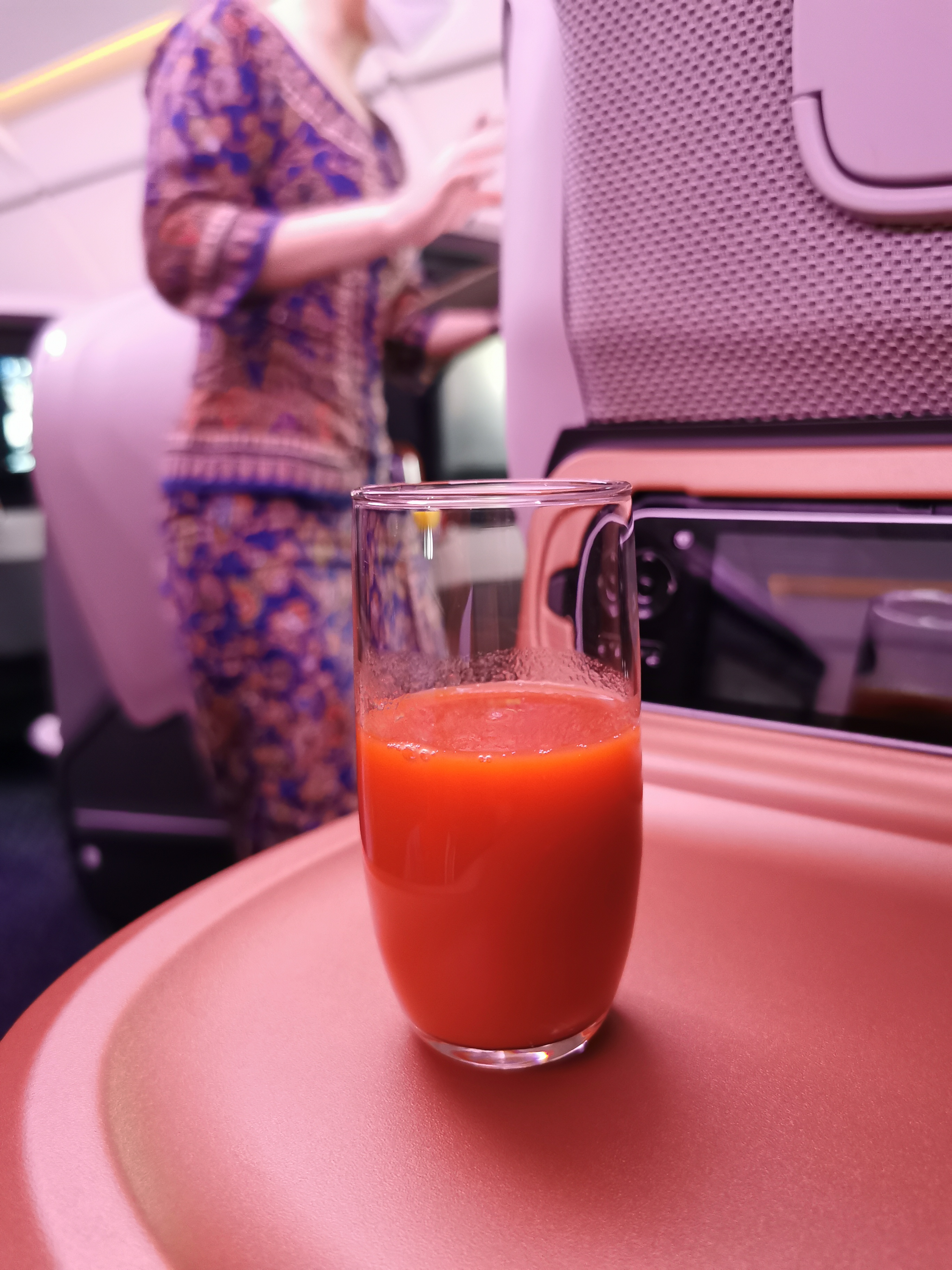 登機後15分鐘機艙服務員提供歡迎飲品,選擇包括蘋果汁、橙汁及蕃茄汁,阿迪哥選擇蕃茄汁。